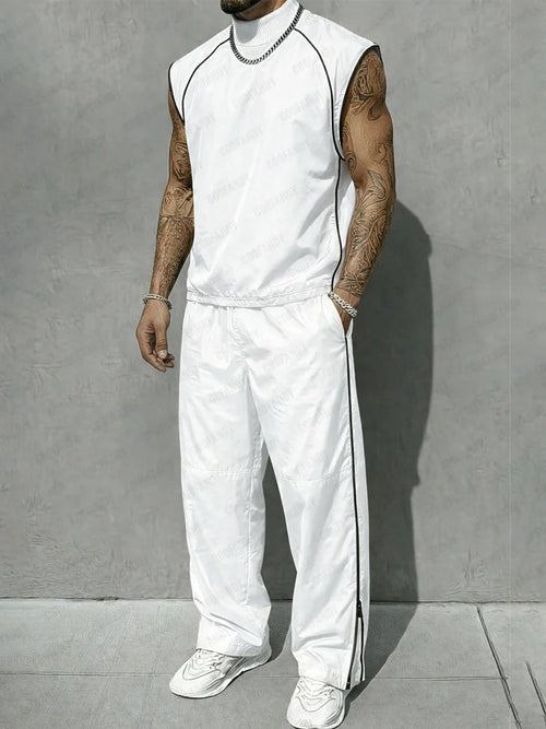 Athletic Contrast Color Ribbed Collar T-shirt Pants Set